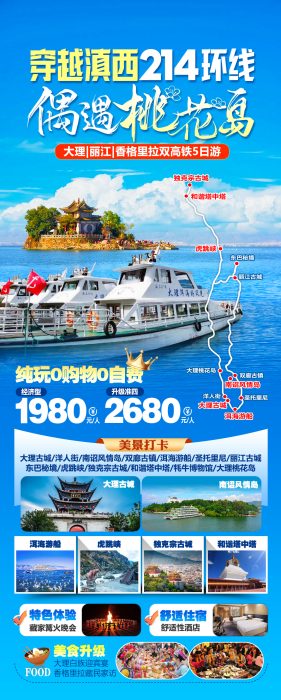 • 1 穿越滇西214环线 偶遇桃花岛(国内长线游)大理古城-洋人街-南诏风情岛-双廊古镇-洱海-圣托里尼-丽江古城-虎跳峡