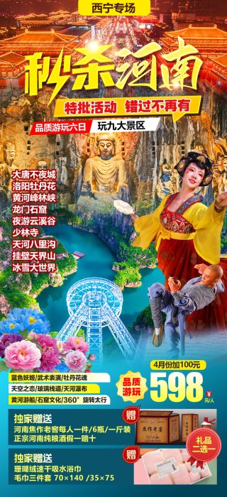 全景河南(长线游)少林寺 龙门石定 洛阳社丹园 夜游洛阳 老君山金顶 。+里画屏 云台山红石快潭源峡·泉爆核万仙山:郭亮村 红旗渠·青年洞 太行大峡谷桃花谷。太行天路清明上河园 。-包公词小宋城。开封黄河